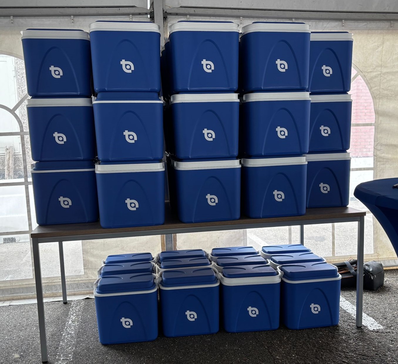 Geniusreclame heeft voor de vakschool 100 koelboxen mogen bestickeren met hun logo aan de voor en achterkant.