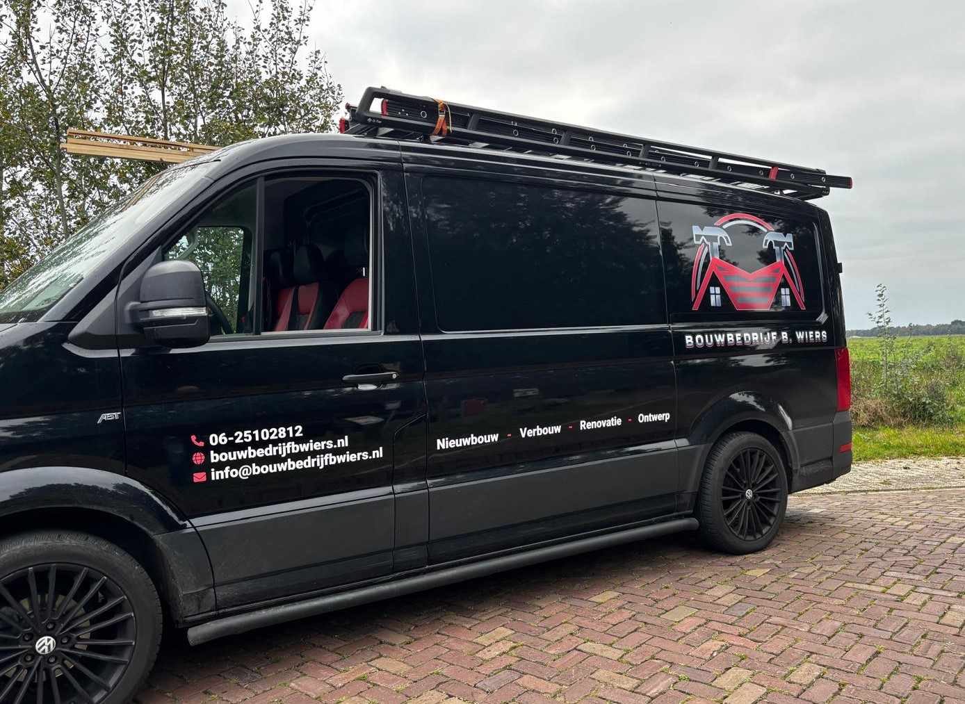 Voor het bouwbedrijf heeft Geniusreclame de bus, 2 aanhangers, verreiker en schaftkeet mogen bestickeren!