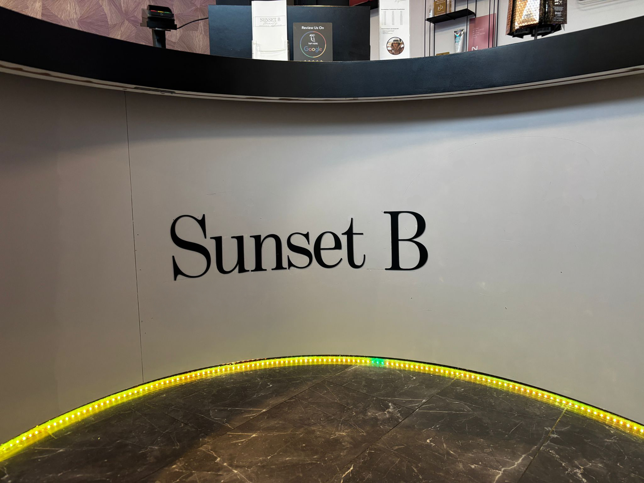 Geniusreclame heeft de balie van Sunset B voorzien van een strak en opvallend gefreesd logo!